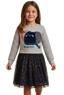 Sukienka dziewczęca Desigual Genevive motyw kota, tiulowy dół, efekt 2w1